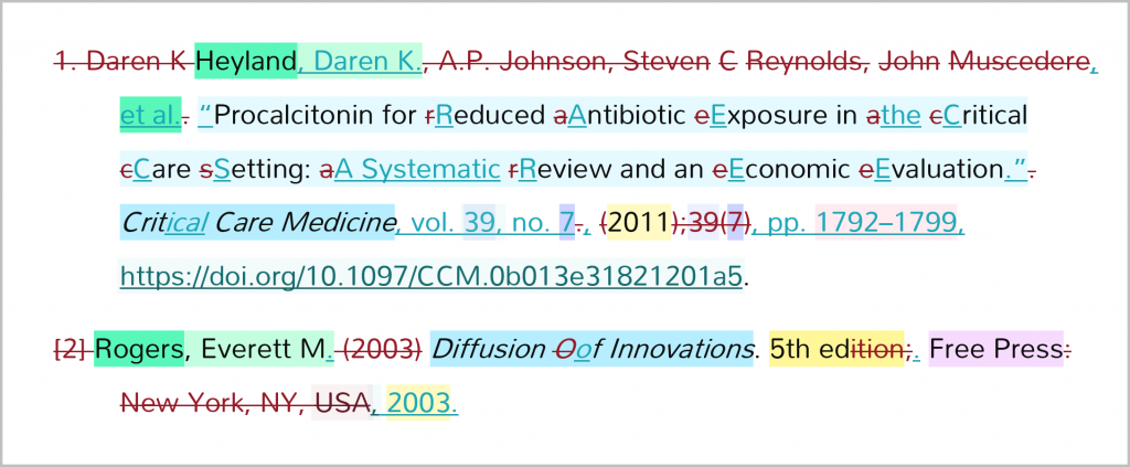 - correct placement and styling of dates, volumes, issues, and page ranges
