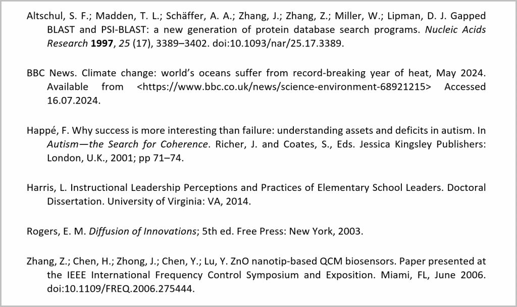 - Abbreviate journal names, without points, no italic.Elide page numbers, e.g. ‘32–8’.